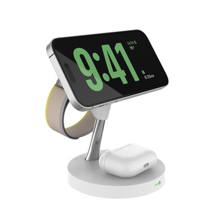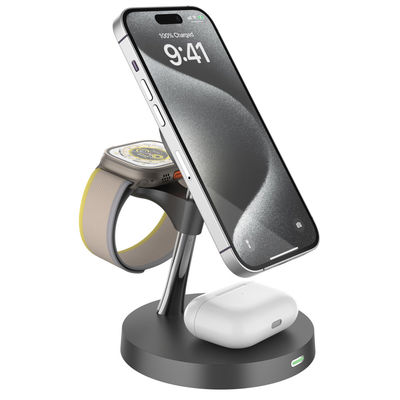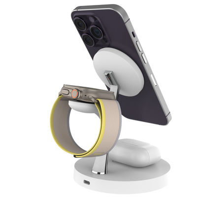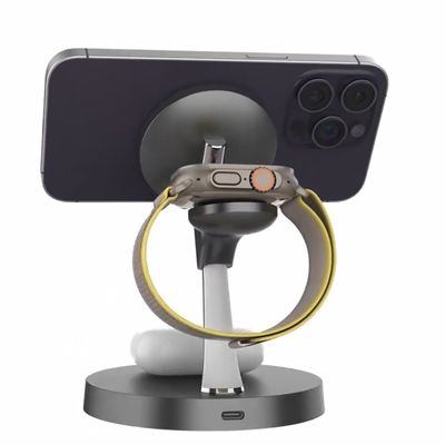 Αυτό το προϊόν είναι ένας πολυλειτουργικός μαγνητικός γρήγορος ασύρματος φορτιστής all-in-one, που πληροί το πρότυπο Qi, ο οποίος μπορεί να υποστηρίξει μαγνητικά τηλέφωνα της σειράς iPhone12/13/14/15, Apple Watch, Samsung Watch, άλλα κινητά τηλέφωνα με πρότυπο QI, Airpods και Samsung TWS. Είναι μια βολική και πρακτική έξυπνη ηλεκτρονική συσκευή. Το μαγνητικό τμήμα αυτού του προϊόντος υιοθετεί σχεδιασμό μαγνητικού πηνίου. Μπορείτε να τοποθετήσετε το τηλέφωνο κάθετα ή οριζόντια κατά τη φόρτιση του τηλεφώνου. Όταν παρακολουθείτε τα αγαπημένα σας βίντεο κατά τη φόρτιση, μπορείτε να ρυθμίσετε το τμήμα φόρτισης πάνω και κάτω για να βρείτε τη σωστή γωνία. Το προϊόν είναι σχεδιασμένο με το μαγνητικό διπλό πηνίο, αυτές οι Πολλαπλές Γωνίες είναι ρυθμιζόμενες και μπορείτε να τοποθετήσετε το τηλέφωνο κάθετα ή οριζόντια χωρίς να επηρεάζεται η φόρτιση.